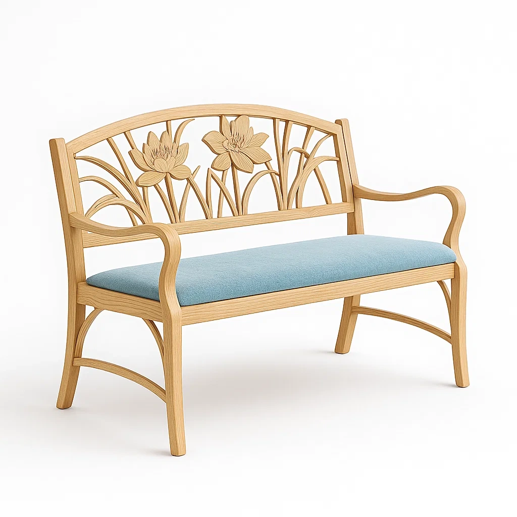 Panca in legno con schienale intagliato e sedile blu