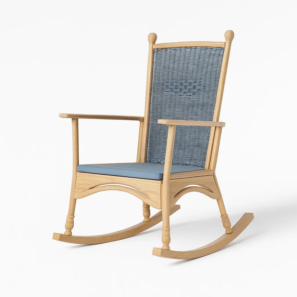 Sedia a dondolo in legno chiaro con seduta blu imbottita