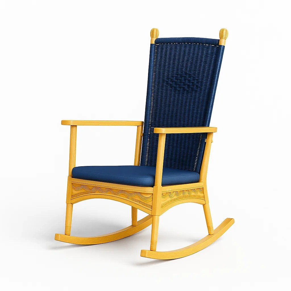 Materiali: Struttura in legno massello, schienale in rattan intrecciato, seduta in tessuto poliestere