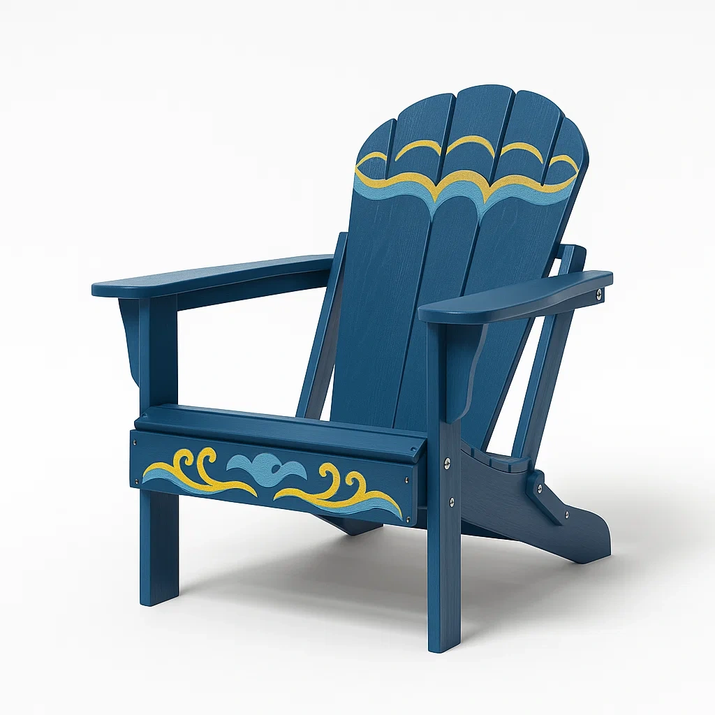 La sedia Adirondack è realizzata in legno verniciato di colore blu con decorazioni gialle e azzurre.