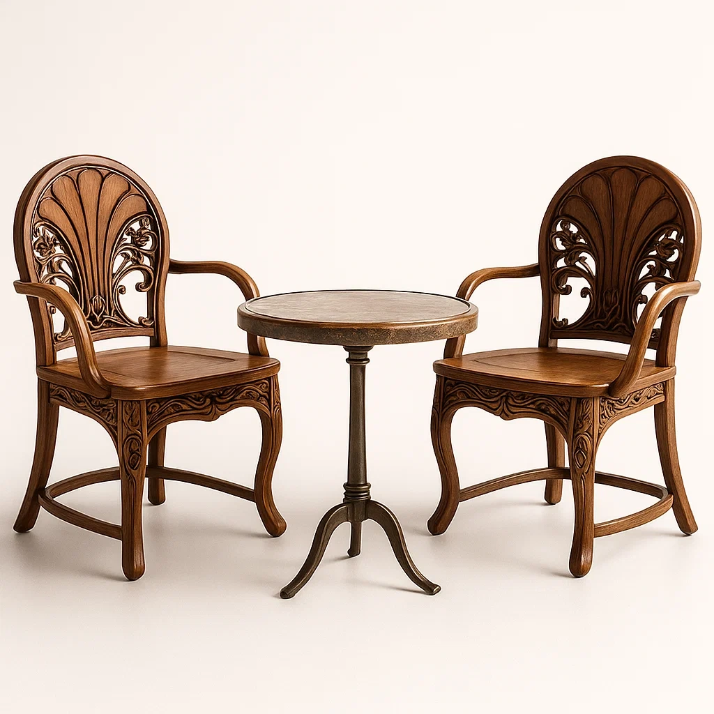 Set bistrot tavolo tondo in metallo e sedie intagliate in legno