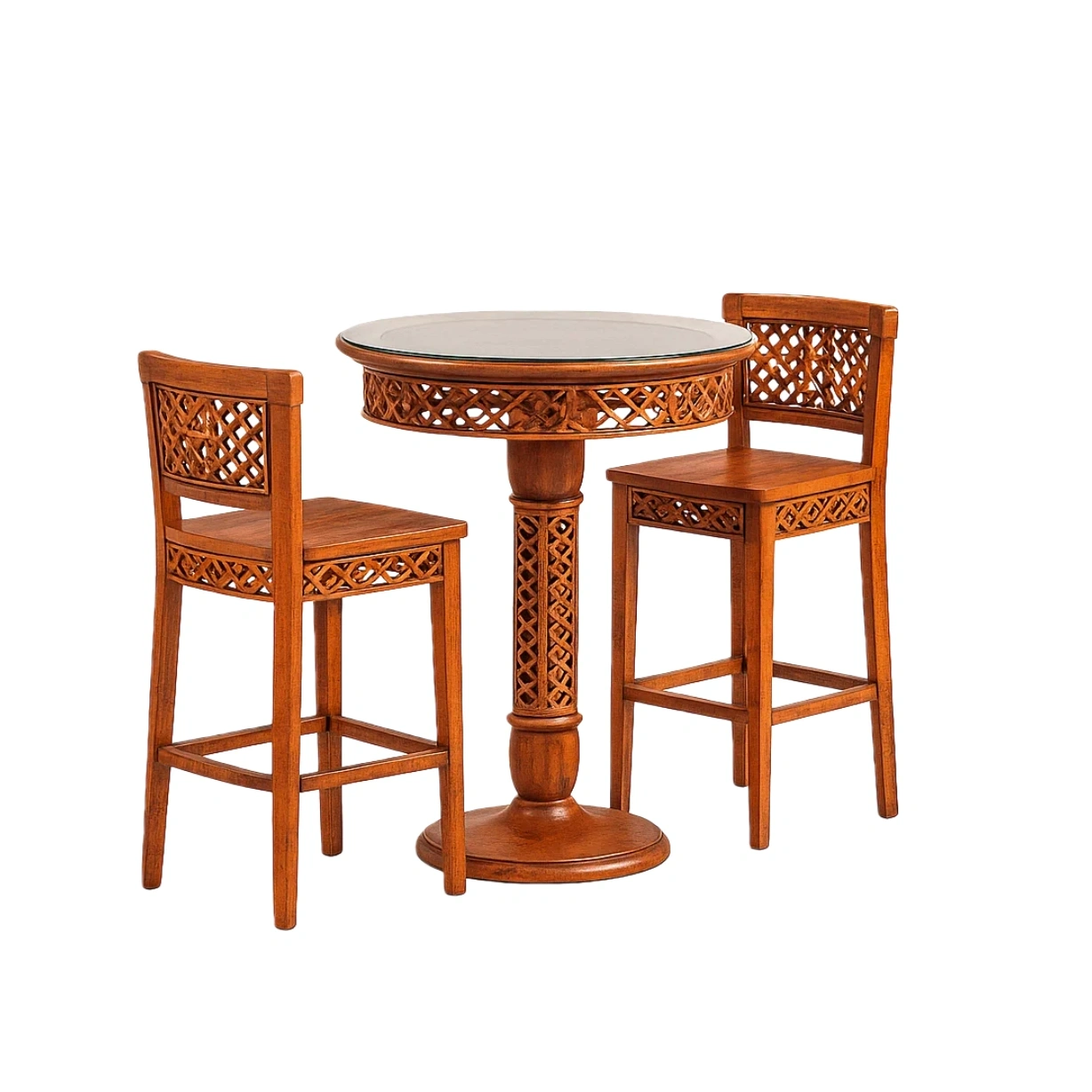 Il tavolo è realizzato in legno intagliato con un piano in vetro temperato da 1 cm.