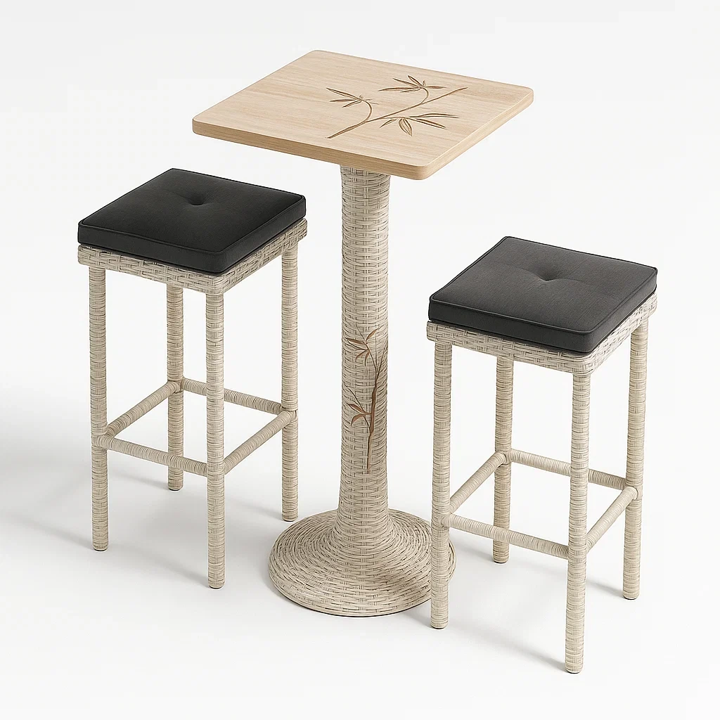 Set tavolo e sedie bar tavolo e sgabelli in resina intrecciata con cuscini in poliestere